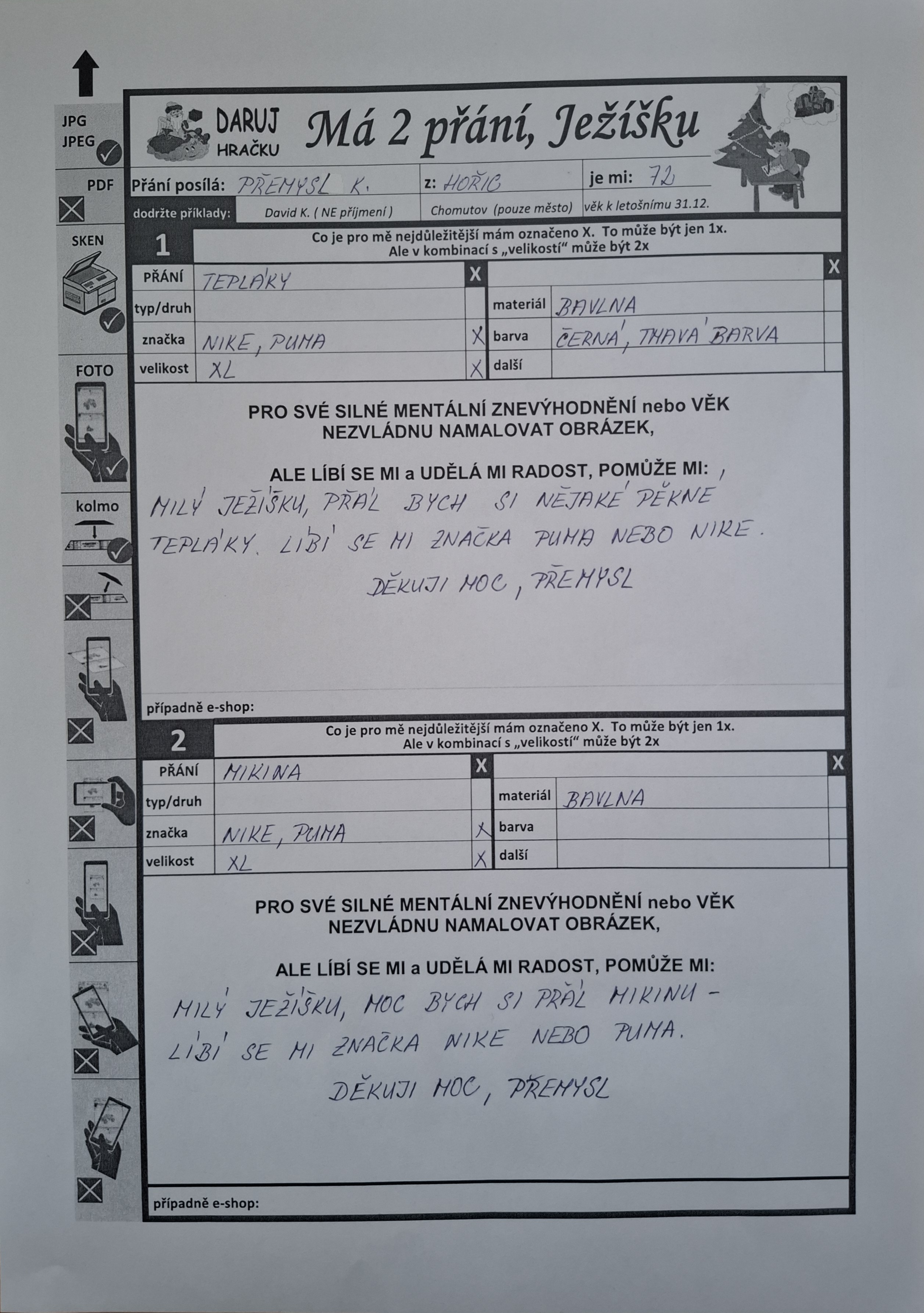 Poznámka: Jsem po mozkové příhodě tělesně postižený a nyní potřebuji pomoc. Kdysi jsem vařil v restauracích. Rád pomáhám při vaření v domově. Mám rád přírodu, zvířata.