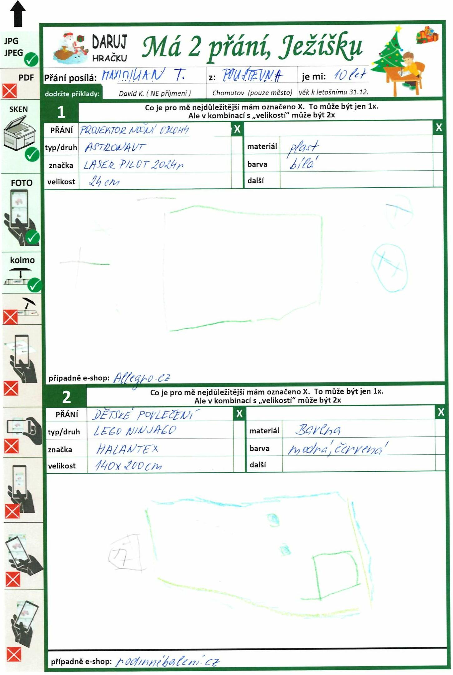 Poznámka: Maximilián rád kreslí, hraje si s auty, dětské společenské hry, sleduje v TV pohádky, učí se jezdit na koloběžce a kole, pomáhá při vaření