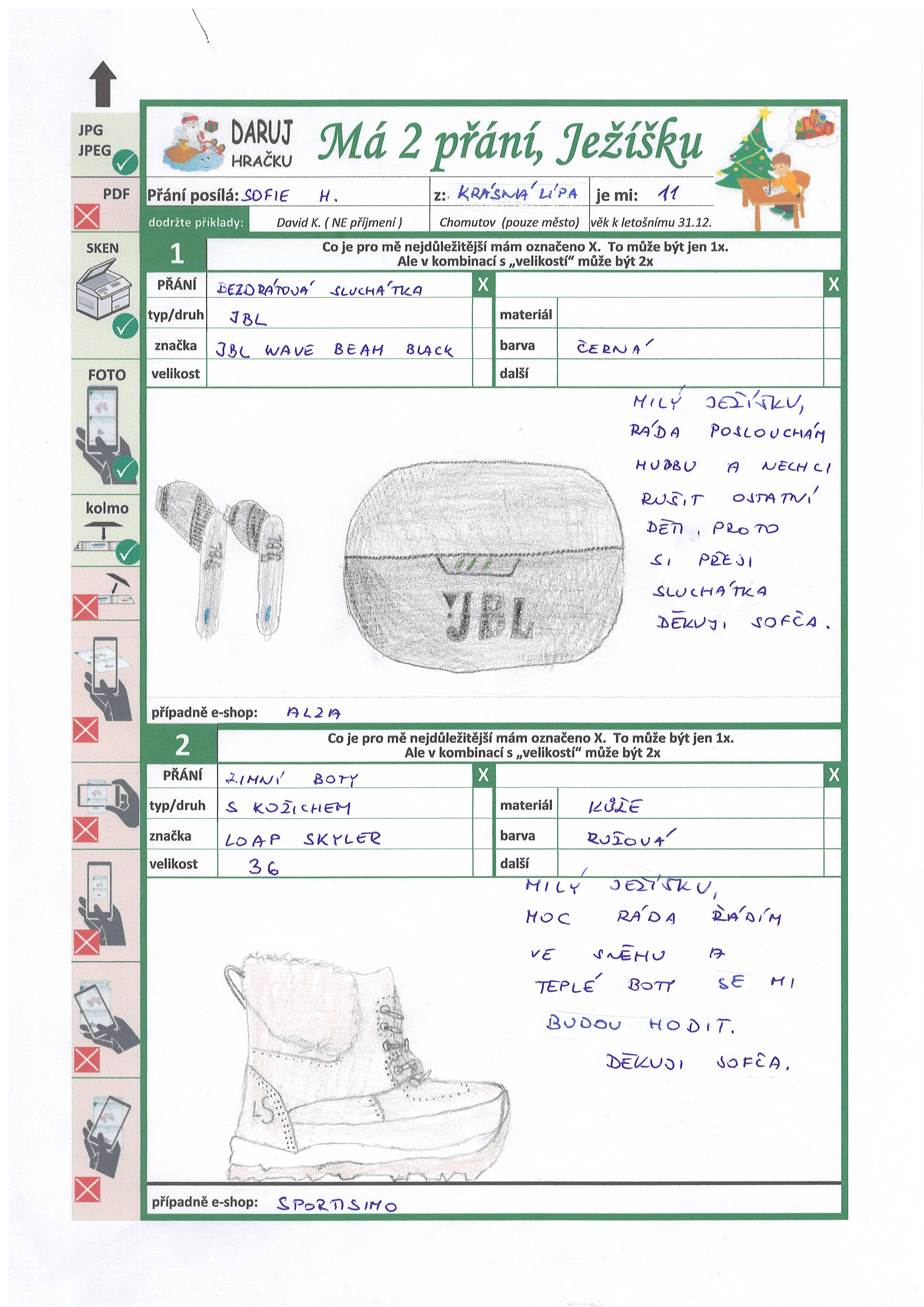 Poznámka: Milý Ježíšku, mam ráda koně a všechny zvířátka. Ráda si maluju a taky jsem velká parádnice. Moc bych si přála sadu na lukostřelbu.
