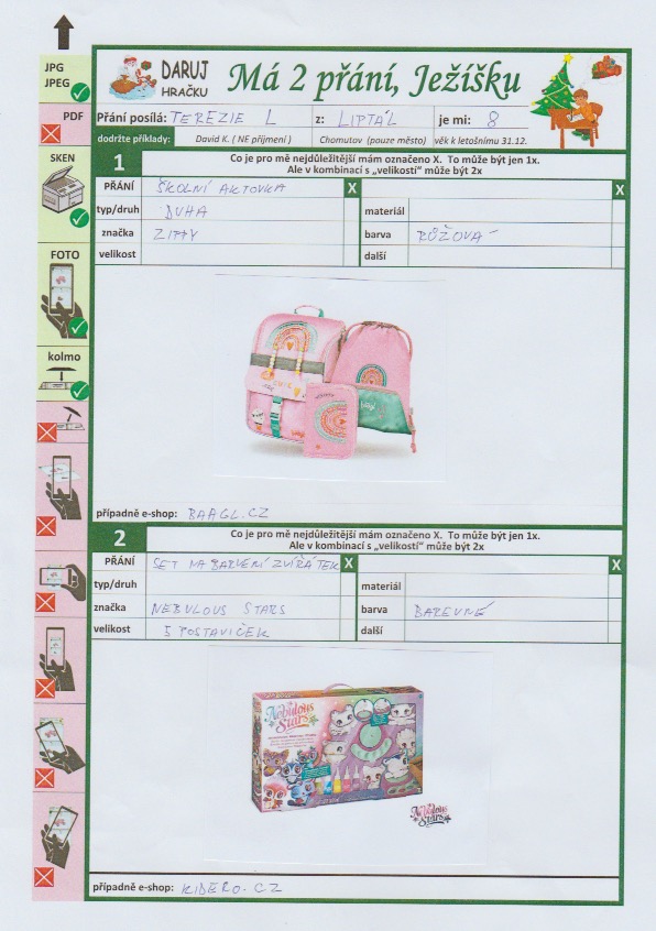 Poznámka: Terezka je holčička, která k nám do domova nově přišla, moc toho o ní zatím nevíme, ale budeme doufat, že i tak se na ní Ježíšek usměje a vykouzlí ji možná první krásné Vánoce plné dárků.