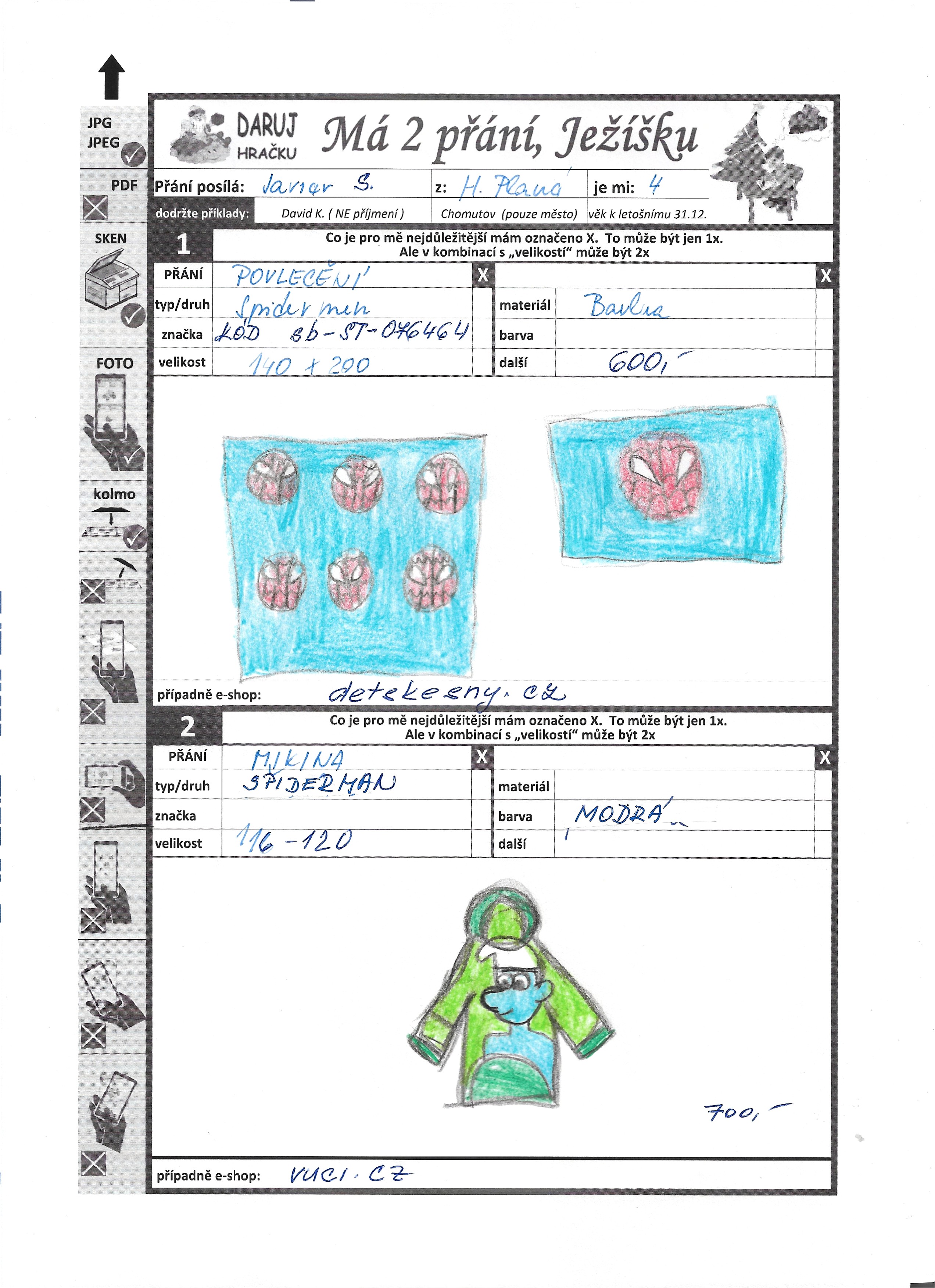 Poznámka: usměvavý klučina, který rád pomáhá, kamarádský, má rád vše od Spidermana